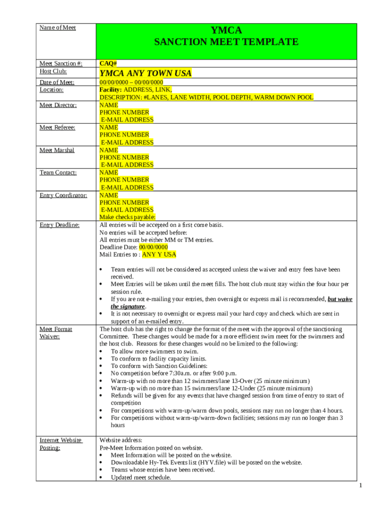 The Name of the Sanctioned Invitational Meet ... is a writable document you can get completed and signed for specified purpose. Next, it is provided to the exact addressee to provide certain info of any kinds. The completion and signing may be done in hard copy or via a trusted service e. g. PDFfiller. These applications help to submit any PDF or Word file without printing them out. While doing that, you can customize its appearance depending on your needs and put legit e-signature. Upon finishing, you send the Name of the Sanctioned Invitational Meet ... to the recipient or several of them by mail and even fax. PDFfiller has a feature and options that make your Word form printable. It provides a number of settings when printing out. It does no matter how you will send a form after filling it out - in hard copy or by email - it will always look well-designed and organized. In order not to create a new writable document from the beginning every time, turn the original file into a template. After that, you will have a rewritable sample.