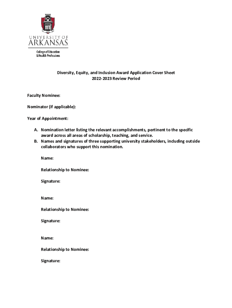 Diversity, Equity, and Inclusion Award Application Cover Sheet 20222023 Review PeriodFaculty Nominee: Nominator (if applicable): Year of Appointment: A. Nomination letter listing the relevant accomplishments,