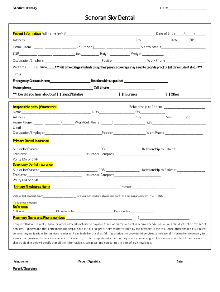 Date___Medical historySonoran Sky Dental Patient Information Full Name (print) ___Date of Birth___/___/___ Address___City___ State___ ZIP___ Home Phone (___) ______ Cell Phone (___) ______ Marital