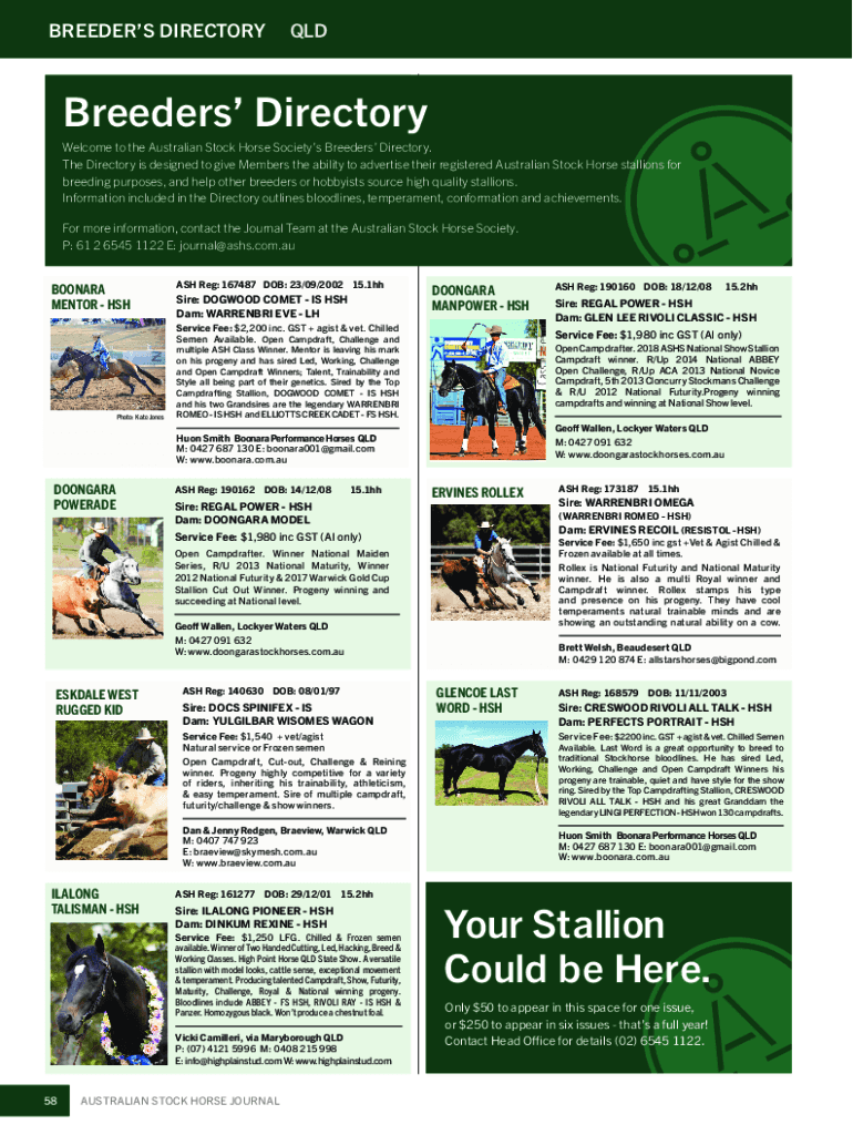 BREEDERS DIRECTORYQLDBreeders Directory Welcome to the Australian Stock Horse Societies Breeders Directory. The Directory is designed to give Members the ability to advertise their registered Australian