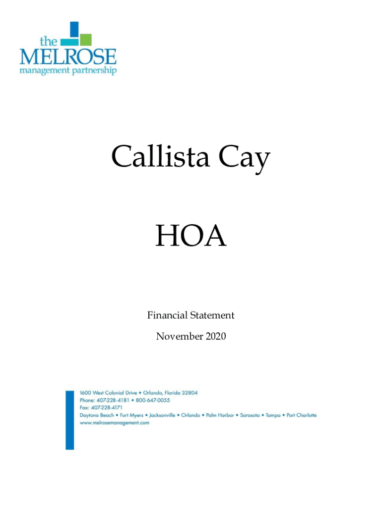 Callisto Cay HOA Financial Statement November 2020Page: 1Callista Cay H.O.A., Inc. Balance Sheet As of 11/30/20 AccountDescriptionOperatingReservesOtherTotalsPresented by: The Melrose Management Partnership