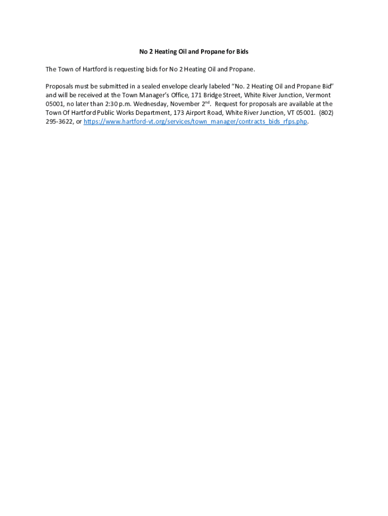No 2 Heating Oil and Propane for Bids The Town of Hartford is requesting bids for No 2 Heating Oil and Propane. Proposals must be submitted in a sealed envelope clearly labeled No. 2 Heating Oil and
