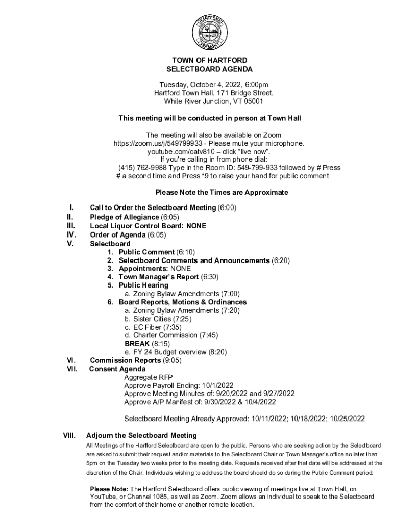 TOWN OF HARTFORD SELECTOR AGENDA Tuesday, October 4, 2022, 6:00pm Hartford Town Hall, 171 Bridge Street, White River Junction, VT 05001 This meeting will be conducted in person at Town Hall The meeting