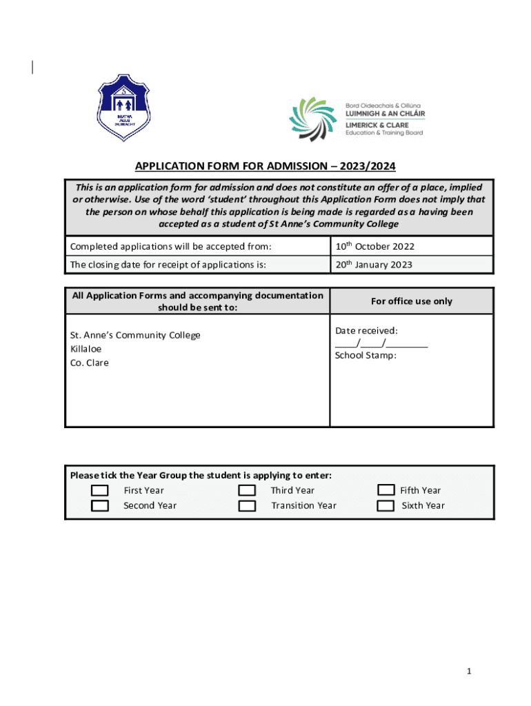 APPLICATION FORM FOR ADMISSION 2023/2024 This is an application form for admission and does not constitute an offer of a place, implied or otherwise. Use of the word student throughout this Application