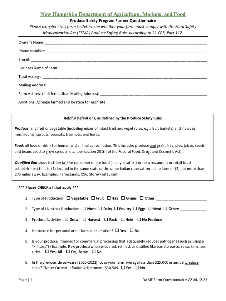 New Hampshire Department of Agriculture, Markets, and Food Produce Safety Program Farmer Questionnaire Please complete this form to determine whether your farm must comply with the Food Safety Modernization