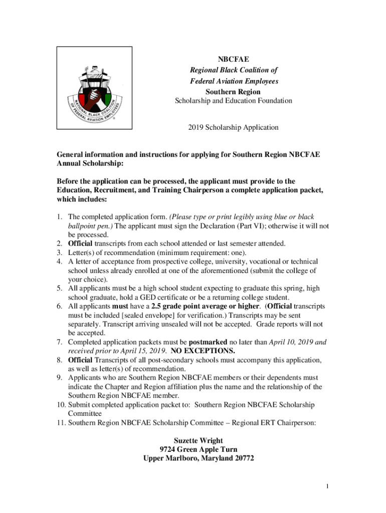 NBC FAE Regional Black Coalition of Federal Aviation Employees Southern Region Scholarship and Education Foundation2019 Scholarship ApplicationGeneral information and instructions for applying for