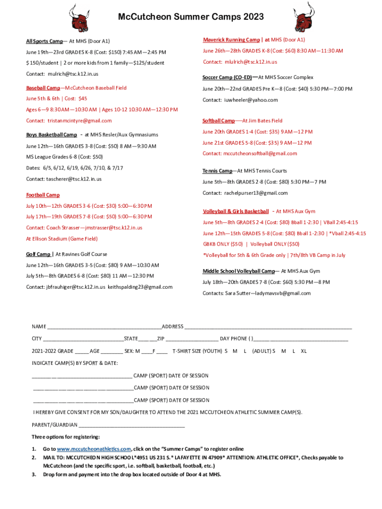 Information such as participant names, emergency contact information, medical history, and any allergies or special needs must be reported on CMU Camps & Clinics forms.