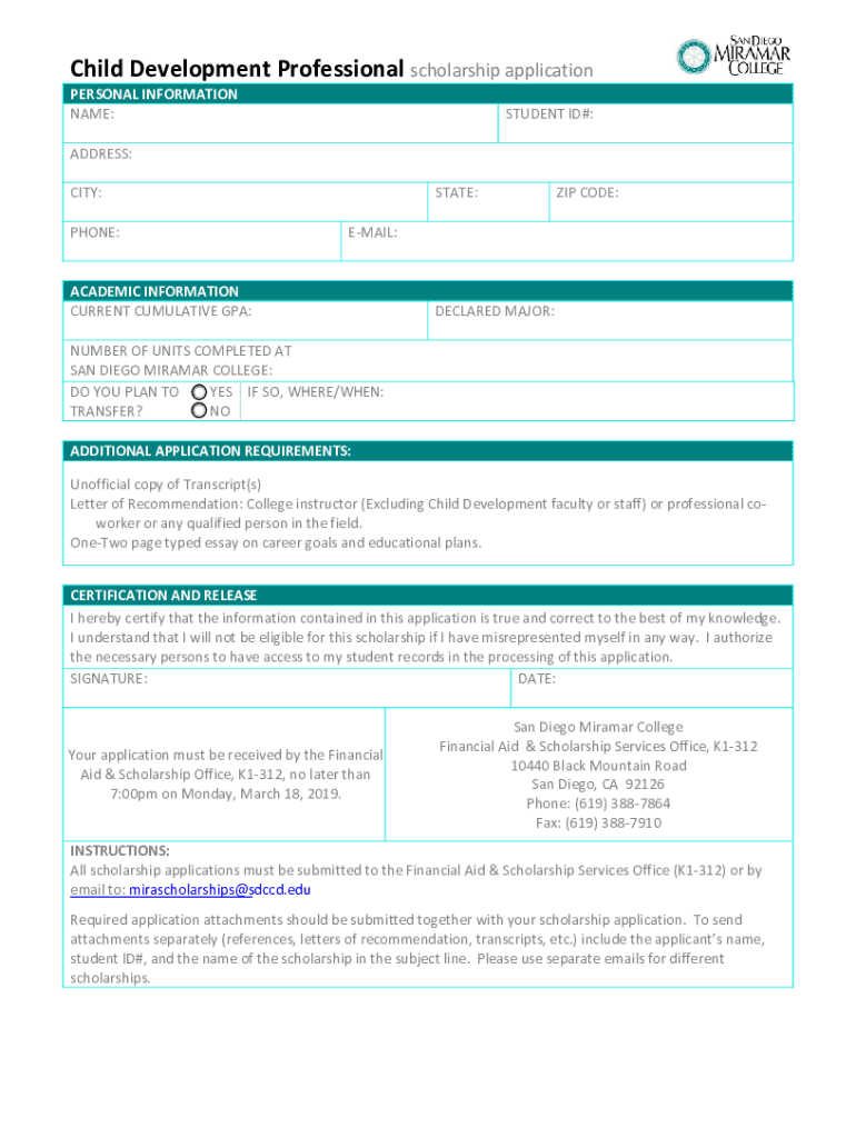 Child Development Professional Scholarship$200Applications can be obtained from the Financial Aid & Scholarship Services Office (K1312) and also online at:https://sdmiramar.edu/campus/scholarshipoffice/applicationsSelection