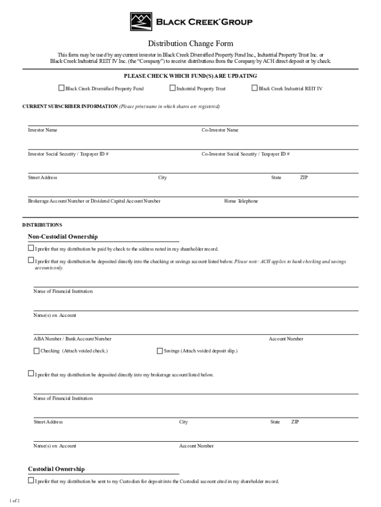 Distribution Change Form This form may be used by any current investor in Black Creek Diversified Property Fund Inc., Industrial Property Trust Inc. or Black Creek Industrial REIT IV Inc. (the Company)