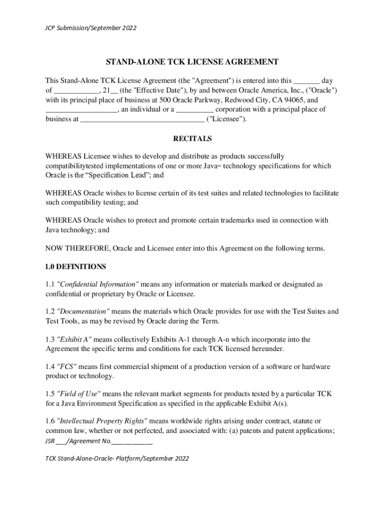 JCP Submission/September 2022STANDALONE TCK LICENSE AGREEMENT This StandAlone TCK License Agreement (the \” Agreement\”) is entered into this ___ day of ___, 21__ (the \” Effective Date\”),