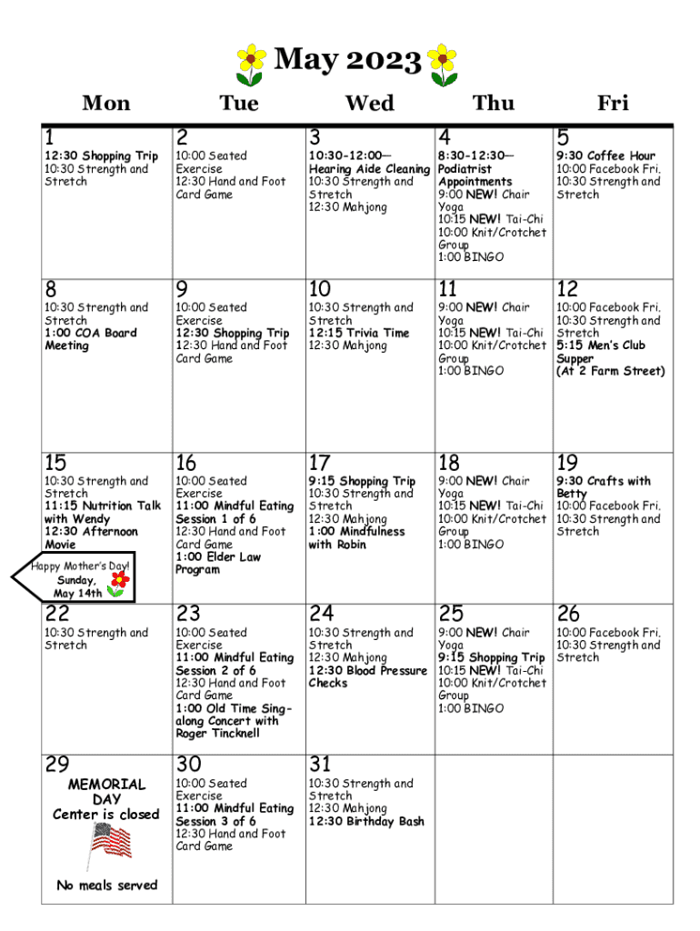 May 2023 MonTueWedThuFri12345891011121516171819222324252629303112:30 Shopping Trip 10:30 Strength and Stretch10:30 Strength and Stretch 1:00 COA Board Meeting10:30 Strength and Stretch 11:15 Nutrition