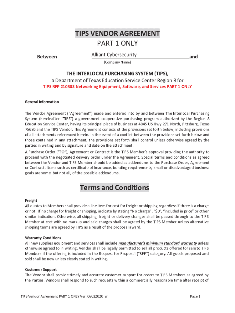 TIPS VENDOR AGREEMENT PART 1 ONLY Between___and(Company Name)THE INTERLOCK PURCHASING SYSTEM (TIPS), a Department of Texas Education Service Center Region 8 for TIPS RFP 210503 Networking Equipment,