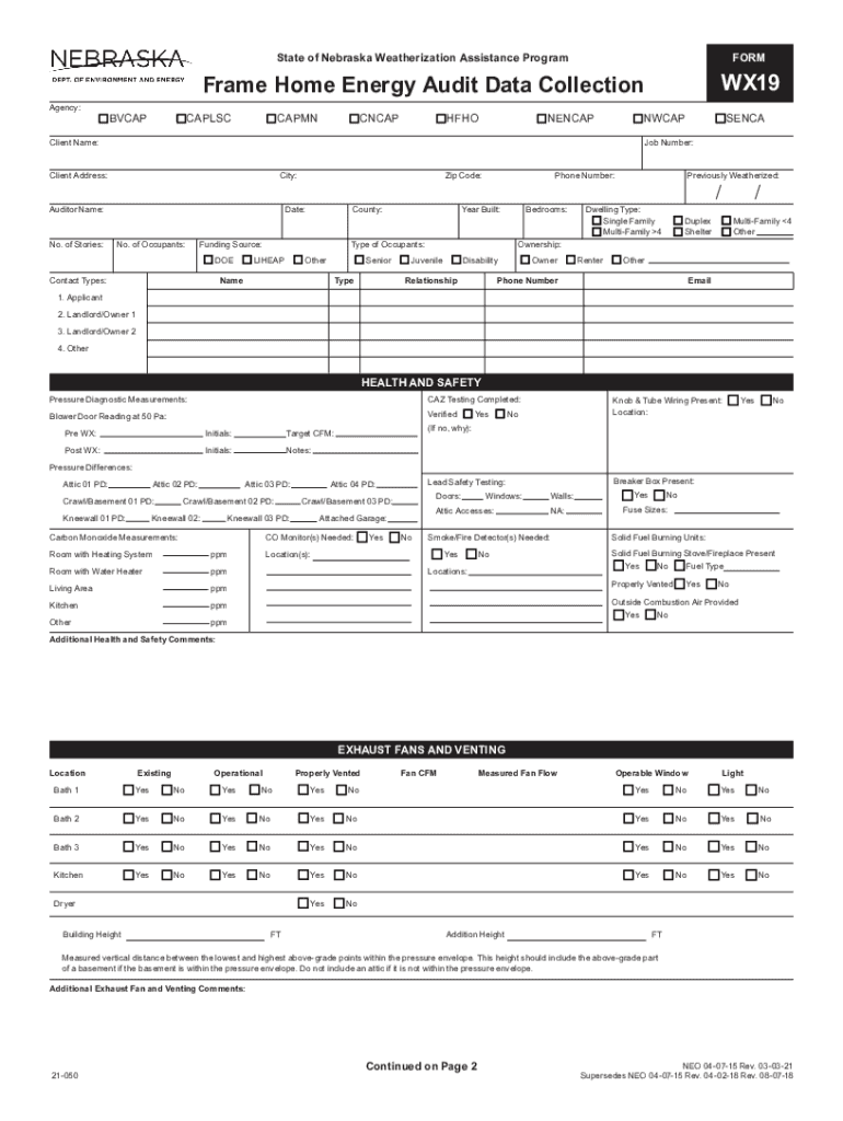 State of Nebraska Weatherization Assistance ProgramFORMFrame Home Energy Audit Data CollectionWX19Agency:BVCAPCAPLSCCAPMNCNCAPHFHONENCAPNWCAPClient Name:Job Number:Client Address:City:Auditor Name:No.