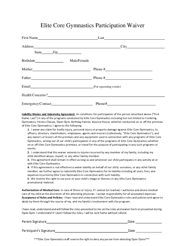 Elite Core Gymnastics Participation Waiver