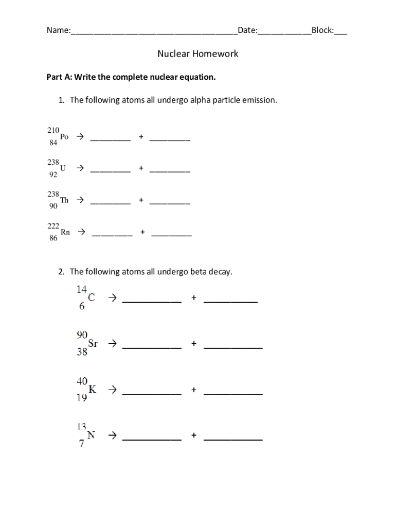 Name:___Date:___Block:___Nuclear Homework Part A: Write the complete nuclear equation. 1. The following atoms all undergo alpha particle emission. 210 Po ___ 84238 92U+ ___ ___ + ___238 The ___ 90+