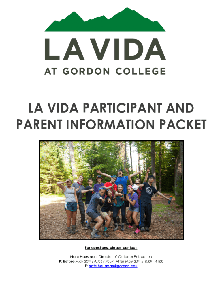 LA VIDA PARTICIPANT AND PARENT INFORMATION Packet questions, please contact: Nate Housman, Director of Outdoor Education P: Before May 20th 978.867.4887, After May 20th 518.891.4188 E: nate.hausman@gordon.eduDear