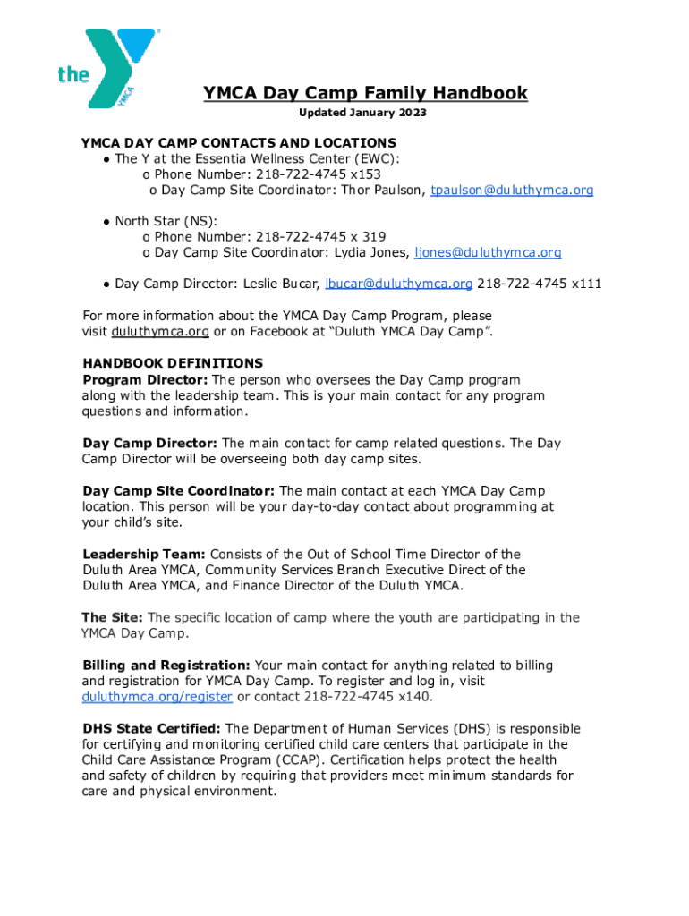 YMCA Day Camp Family Handbook Updated January 2023YMCA DAY CAMP CONTACTS AND LOCATIONS The Y at the Essential Wellness Center (ETC): o Phone Number: 2187224745 x153 o Day Camp Site Coordinator: Thor