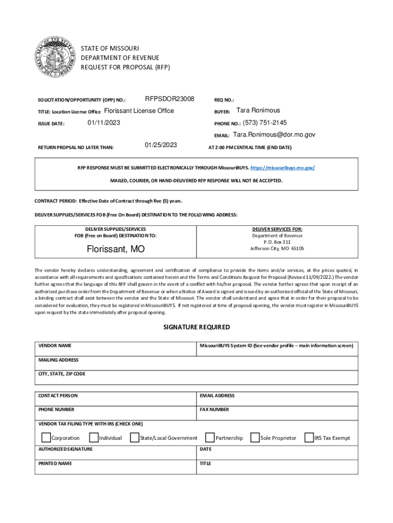 STATE OF MISSOURI DEPARTMENT OF REVENUE REQUEST FOR PROPOSAL (RFP)SOLICITATION/OPPORTUNITY (OPP) NO.: TITLE: Location License Officer NO.:RFPSDOR2300801/11/2023ISSUE DATE:Tara RonimousBUYER:Florissant