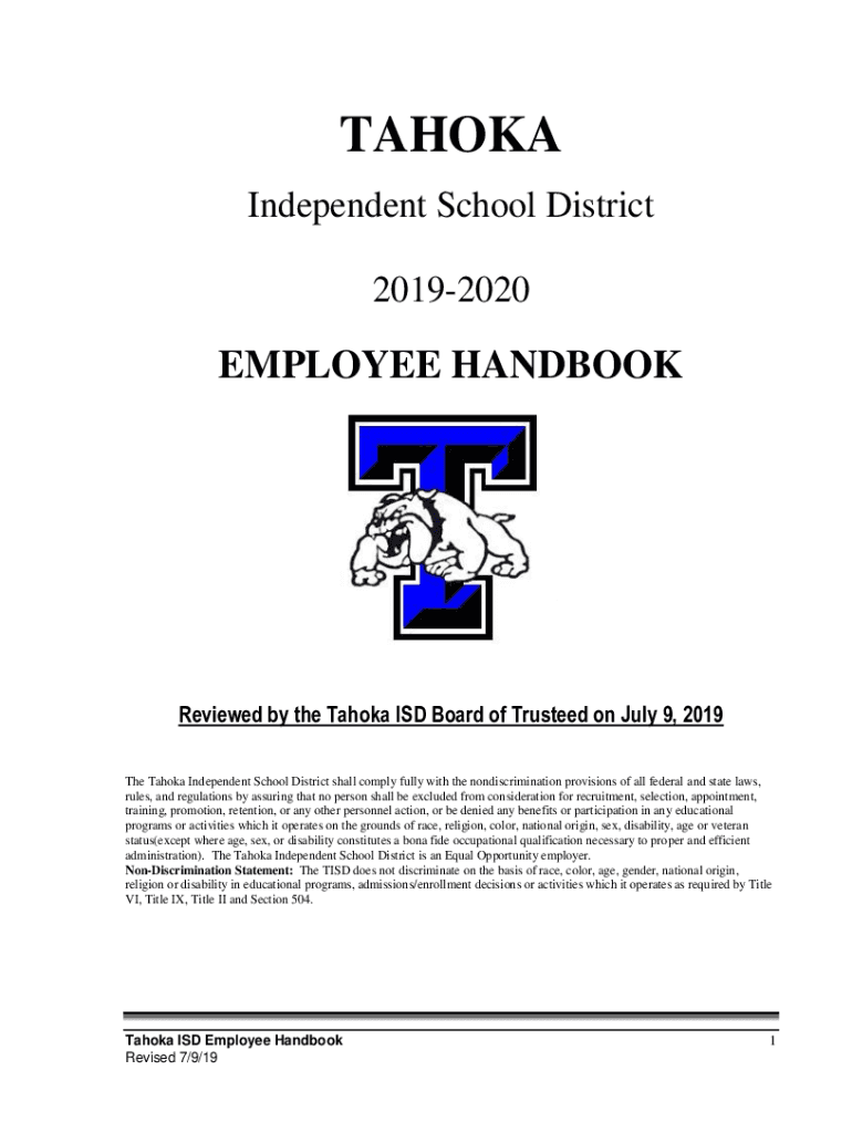 TAHOMA Independent School District 20192020EMPLOYEE HANDBOOKReviewed by the Tahoma ISD Board of Trustees on July 9, 2019, The Tahoma Independent School District shall comply fully with the nondiscrimination