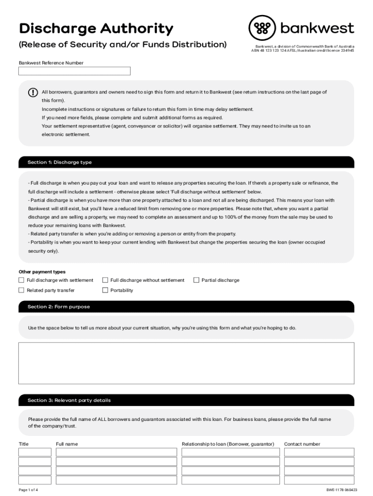 Discharge Authority (Release of Security and/or Funds Distribution)Banquet, a division of Commonwealth Bank of Australia ABN 48 123 123 124 ADSL/Australian credit license 234945Bankwest Reference