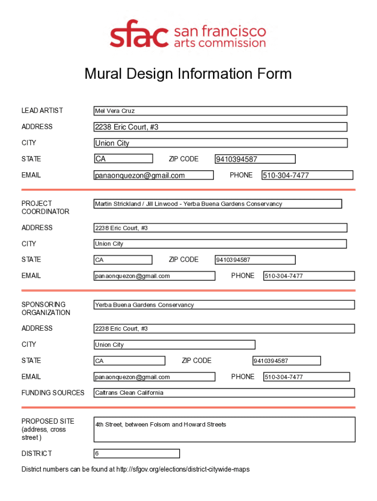 Mural Design Information Form LEAD ARTIST Mel Vera CruzADDRESS2238 Eric Court, #3CITYUnion CitySTATECAEMAILpanaonquezon@gmail.comPROJECT COORDINATOR Martin Strickland / Jill Linwood Yerba Buena Gardens