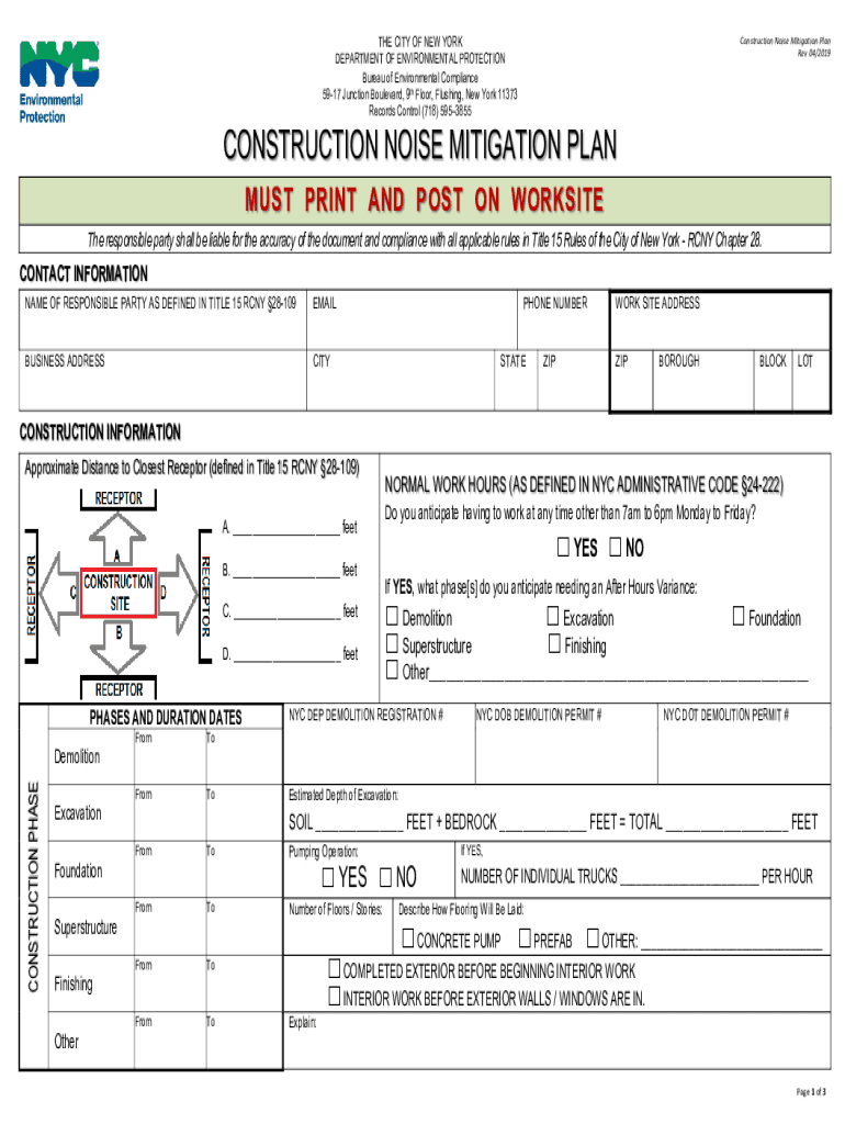 Construction Noise Mitigation Plan Rev 04/2019THE CITY OF NEW YORK DEPARTMENT OF ENVIRONMENTAL PROTECTION Bureau of Environmental Compliance 5917 Junction Boulevard, 9th Floor, Flushing, New York