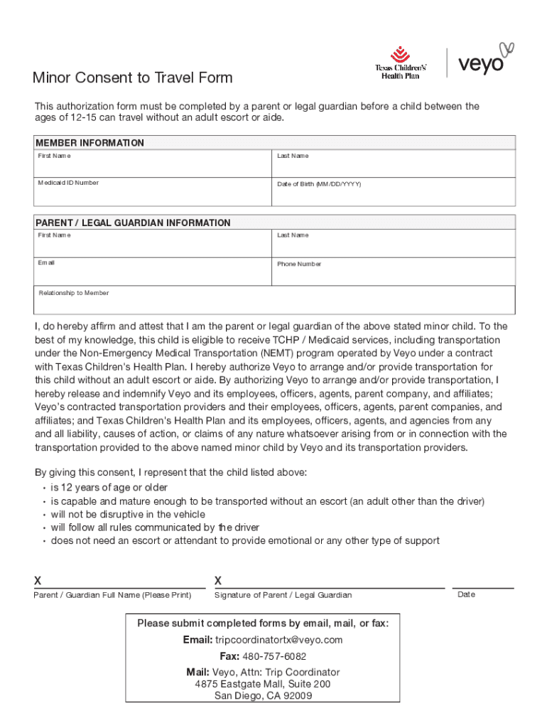 Minor Consent to Travel Form This authorization form must be completed by a parent or legal guardian before a child between the ages of 1215 can travel without an adult escort or aide. MEMBER INFORMATION