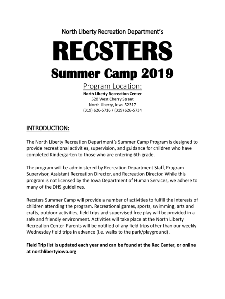 North Liberty Recreation DepartmentsRECSTERSSummer Camp 2019 Program Location: North Liberty Recreation Center 520 West Cherry Street North Liberty, Iowa 52317 (319) 6265716 / (319) 6265734INTRODUCTION:
