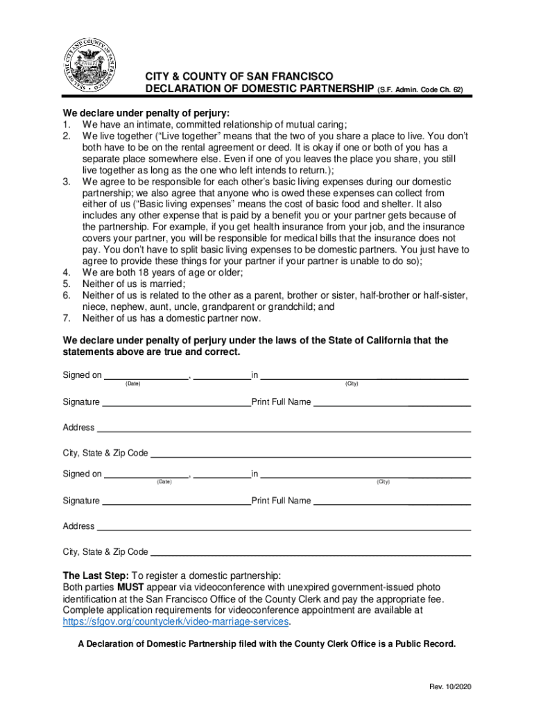 CITY & COUNTY OF SAN FRANCISCO DECLARATION OF DOMESTIC PARTNERSHIP(S.F. Admin. Code Ch. 62)We declare under penalty of perjury: 1. We have an intimate, committed relationship of mutual caring; 2.