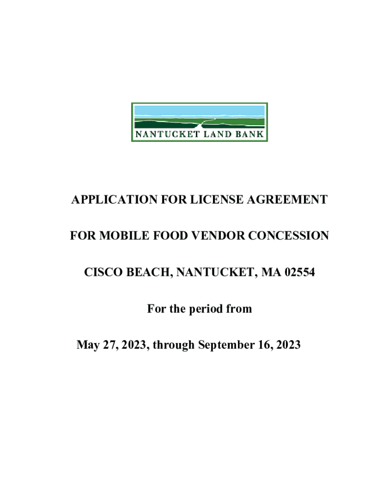 APPLICATION FOR LICENSE AGREEMENT FOR MOBILE FOOD VENDOR CONCESSION CISCO BEACH, NANTUCKET, MA 02554 For the period from May 27, 2023, through September 16, 2023SECTION I. INTRODUCTION AND BACKGROUND