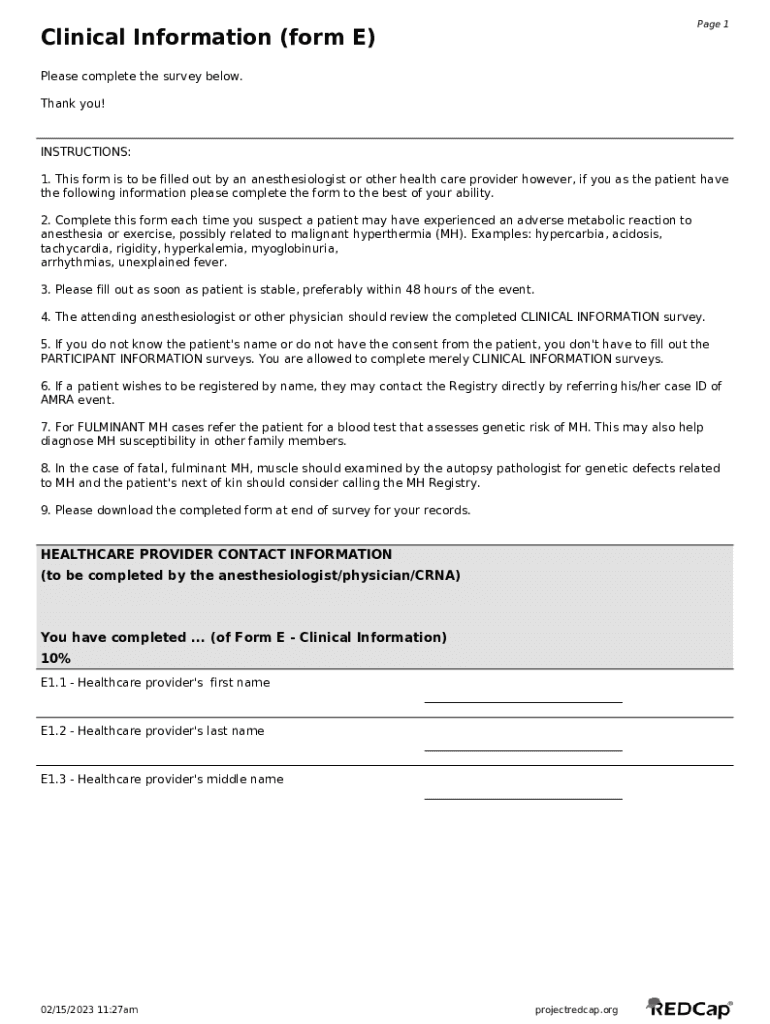 Page 1Clinical Information (form E) Please complete the survey below. Thank you!INSTRUCTIONS: 1. This form is to be filled out by an anesthesiologist or other health care provider however, if you