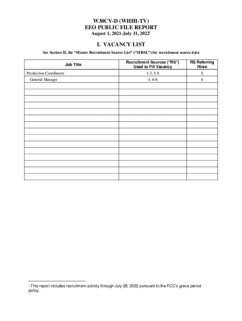 W30CVD (WHITE) EEO PUBLIC FILE REPORT August 1, 2021July 31, 20221I. VACANCY LIST See Section II, the Master Recruitment Source List (MRS) for recruitment source data Job Title Production Coordinator