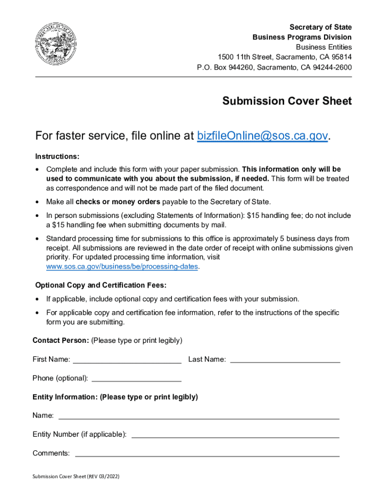 Secretary of State Business Programs Division Business Entities 1500 11th Street, Sacramento, CA 95814 P.O. Box 944260, Sacramento, CA 942442600Submission Cover Sector faster service, file online