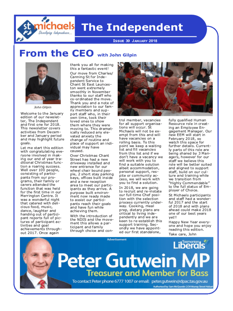 The Independent www.stmichaels.as n.issue 39 JANUARY 2018From the CEO John GilpinWelcome to the January edition of our newsletter, The Independent and first one for 2018. This newsletter covers activities