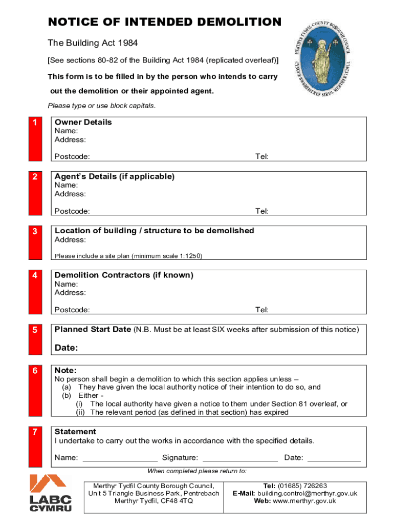 NOTICE OF INTENDED DEMOLITION The Building Act 1984 [See sections 8082 of the Building Act 1984 (replicated overleaf)] This form is to be filled in by the person who intends to carry out the demolition