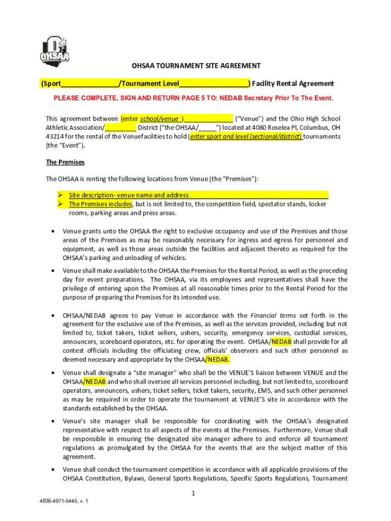 OHSA TOURNAMENT SITE AGREEMENT (Sport___/Tournament Level___) Facility Rental Agreement PLEASE COMPLETE, SIGN AND RETURN PAGE 5 TO: NE DAB Secretary Prior To The Event. This agreement between (enter