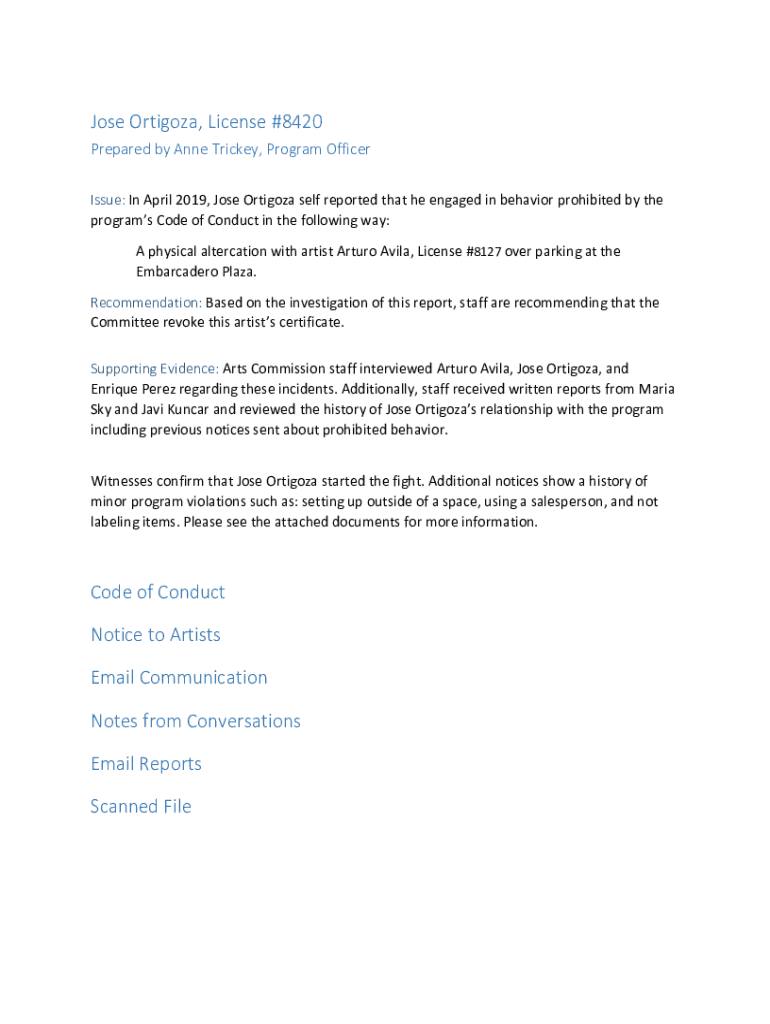 Jose Ortega, License #8420 Prepared by Anne Tricked, Program Officer Issue: In April 2019, Jose Ortega self reported that he engaged in behavior prohibited by the programs Code of Conduct in the following