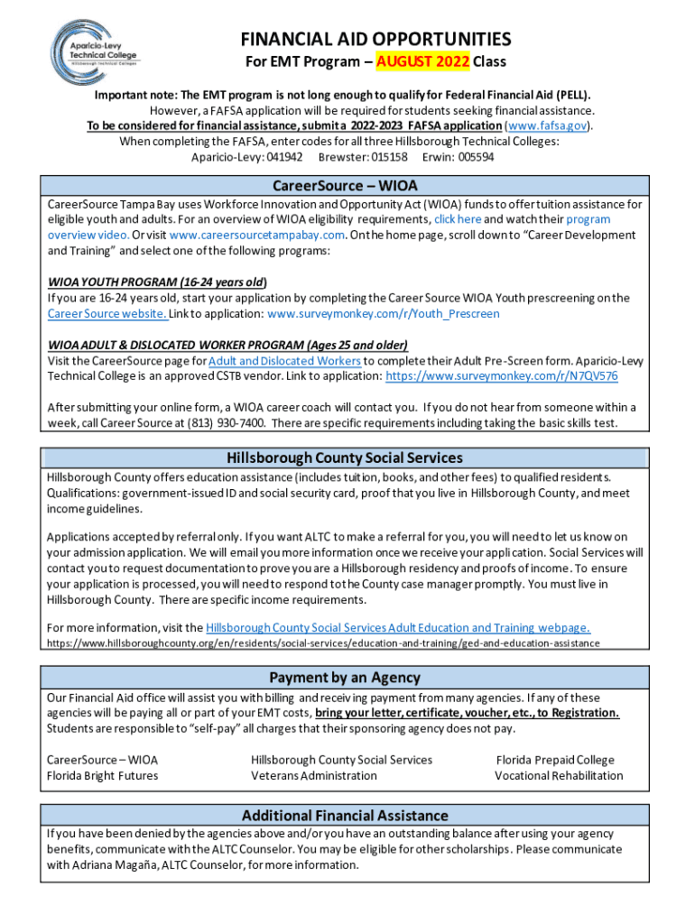 FINANCIAL AID OPPORTUNITIES For EMT Program AUGUST 2022 Class Important note: The EMT program is not long enough to qualify for Federal Financial Aid (WELL). However, a FAFSA application will be required