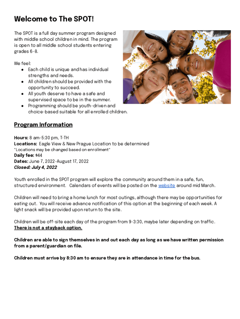 Welcome to The SPOT! The SPOT is a full day summer program designed with middle school children in mind. The program is open to all middle school students entering grades 68. We feel: Each child is