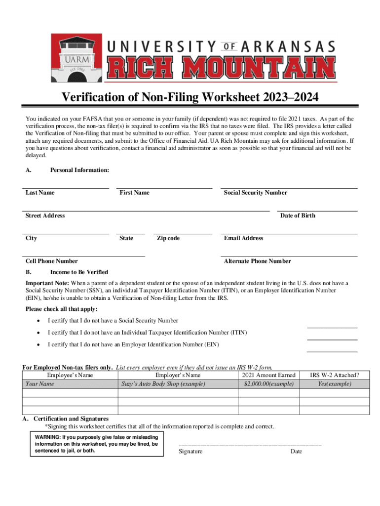 Get the free Verification of Non-Filing Worksheet 20232024
