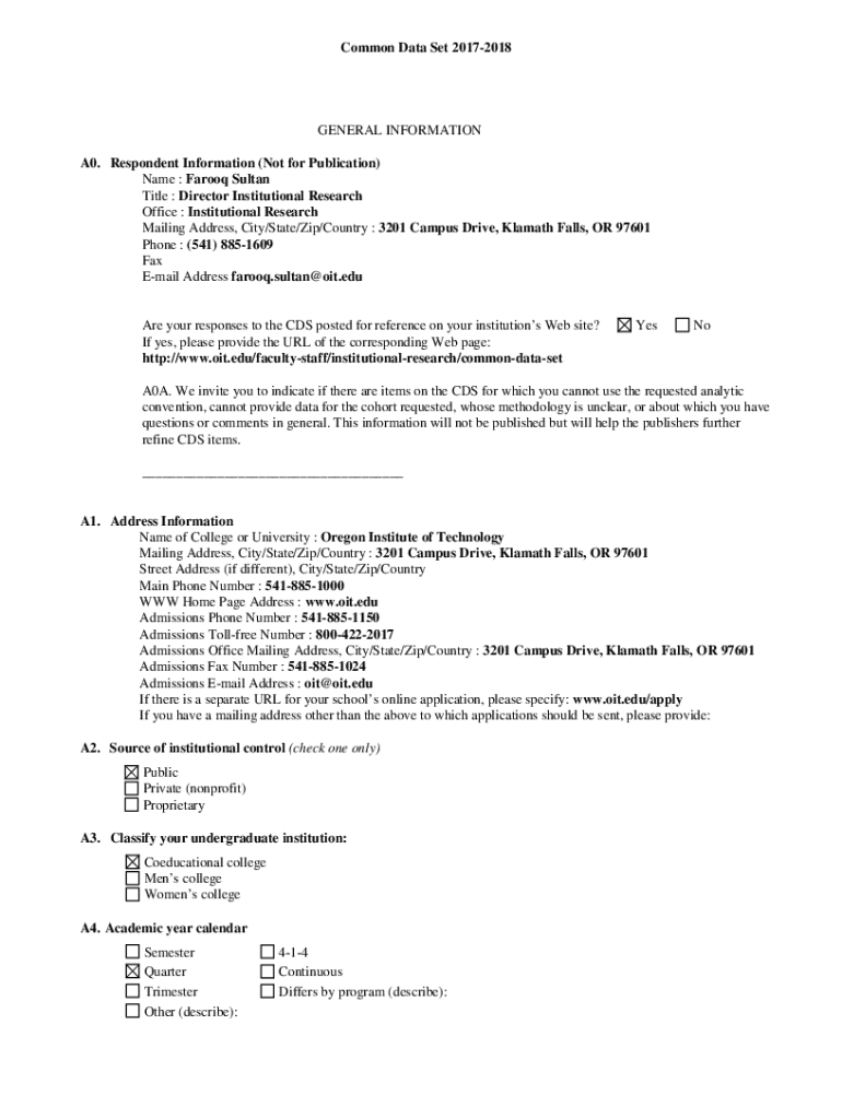 Common Data Set 20172018GENERAL INFORMATION A0. Respondent Information (Not for Publication) Name : Farooq Sultan Title : Director Institutional Research Office : Institutional Research Mailing Address,