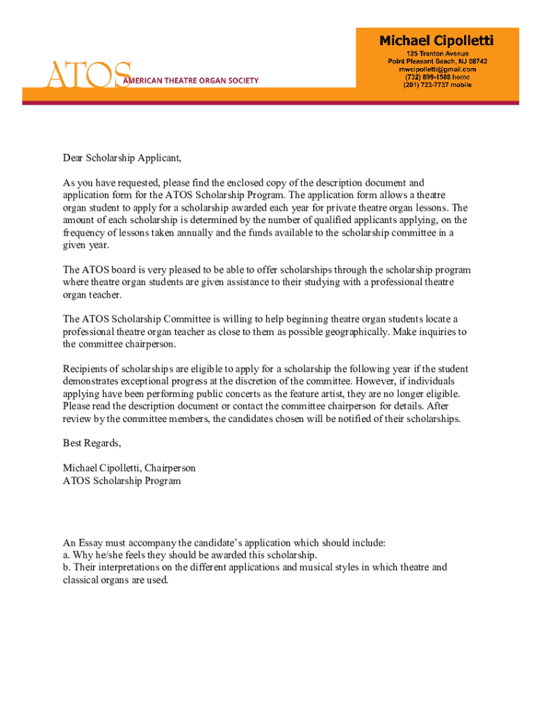Dear Scholarship Applicant, As you have requested, please find the enclosed copy of the description document and application form for the ATOS Scholarship Program. The application form allows a theater