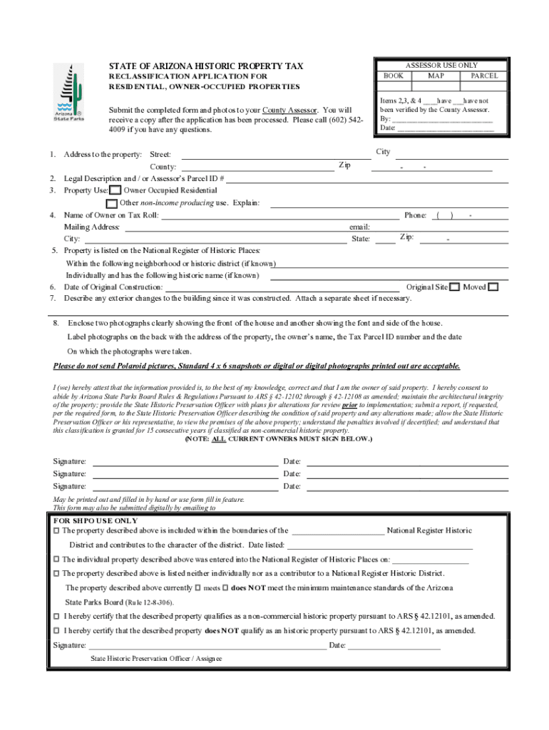 STATE OF ARIZONA HISTORIC PROPERTY TAX RECLASSIFICATION APPLICATION FOR RESIDENTIAL, OWNEROCCUPIED PROPERTIESBOOKSubmit the completed form and photos to your County Assessor. You will receive a copy
