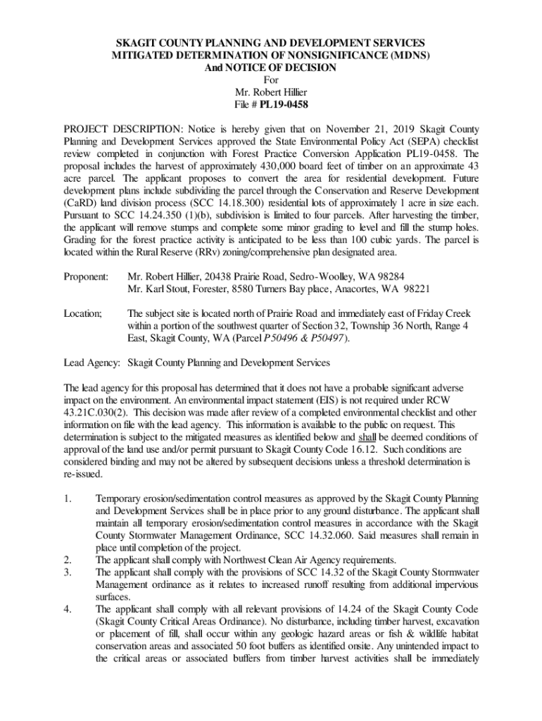Get the free NOTICE OF MITIGATED DETERMINATION OF NONSIGNIFICANCE (MDNS)