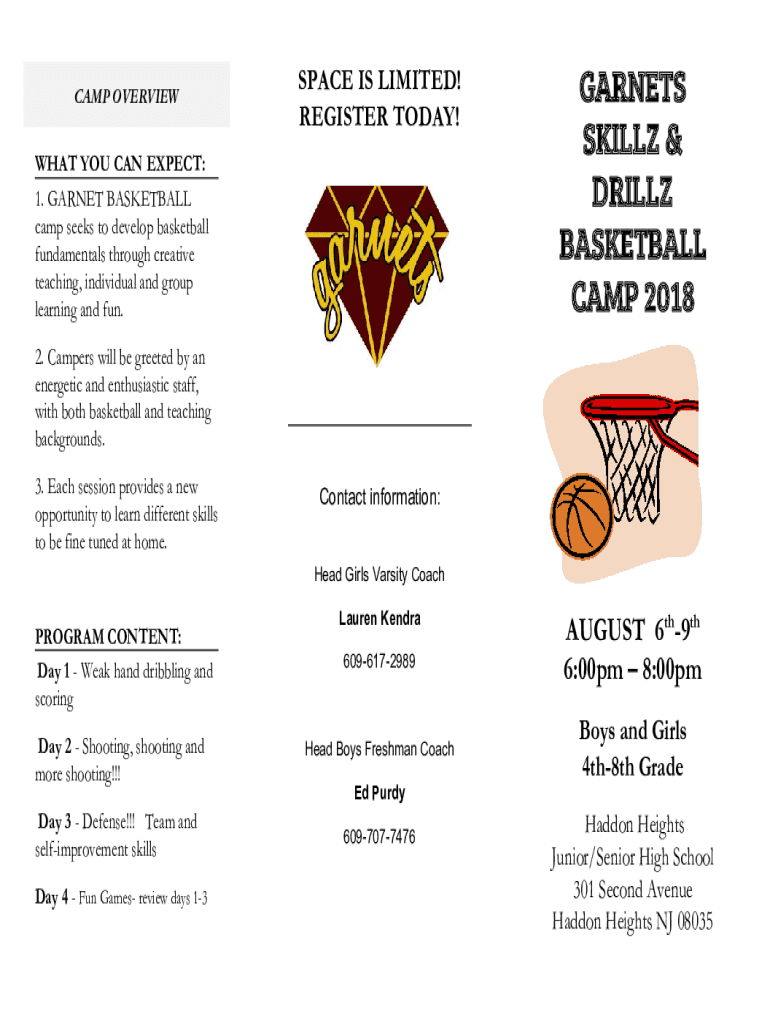 WHAT YOU CAN EXPECT: 1. GARNET BASKETBALL camp seeks to develop basketball fundamentals through creative teaching, individual and group learning and fun. 2. Campers will be greeted by an energetic