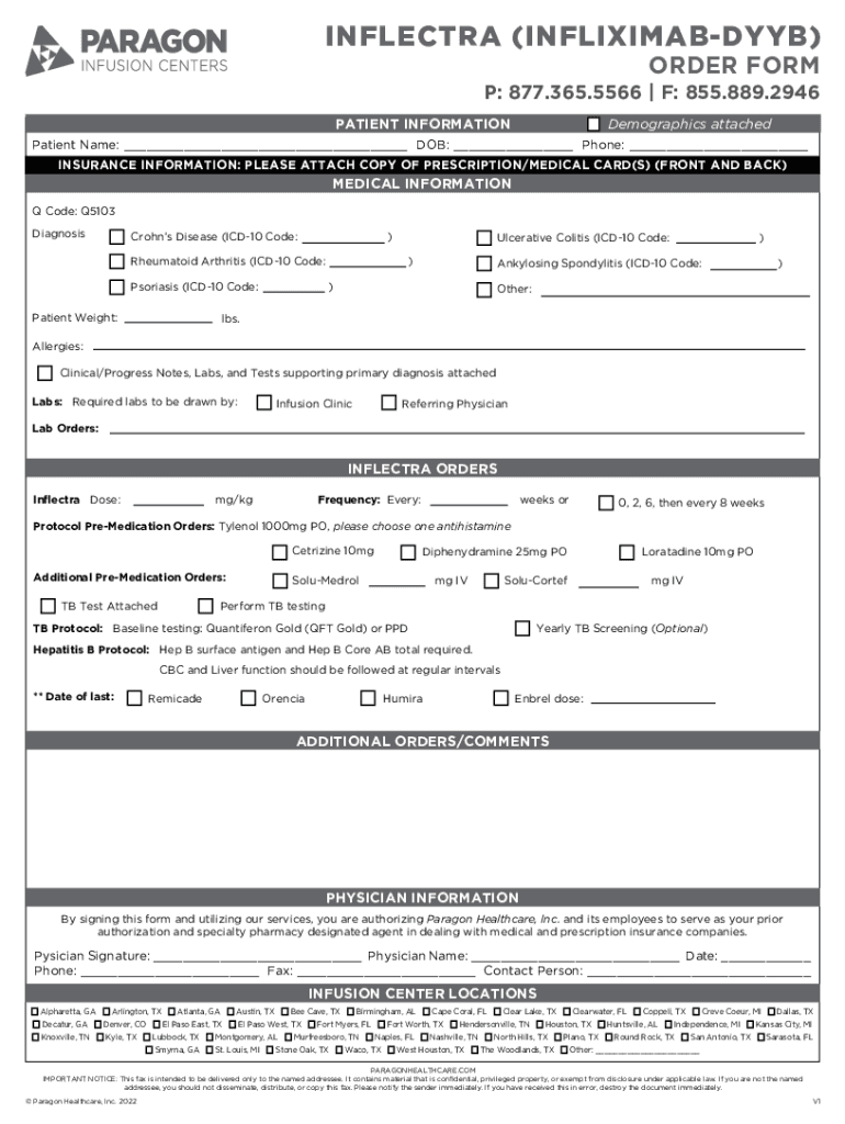 INFLECTED (INFLIXIMABDYYB) ORDER FORM: 877.365.5566 | F: 855.889.2946 PATIENT INFORMATIONDemographics attachedPatient Name: ___ DOB: ___ Phone: ___ INSURANCE INFORMATION: PLEASE ATTACH COPY OF PRESCRIPTION/MEDICAL