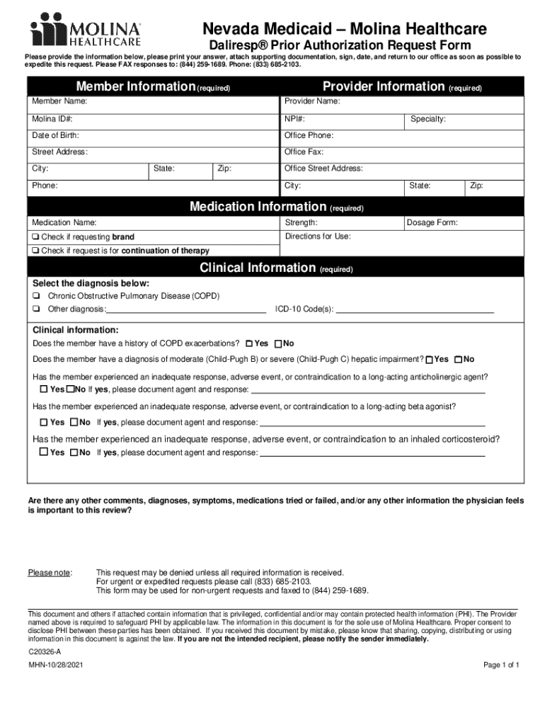 Nevada Medicaid Molina Healthcare Dali resp Prior Authorization Request Form Please provide the information below, please print your answer, attach supporting documentation, sign, date, and return