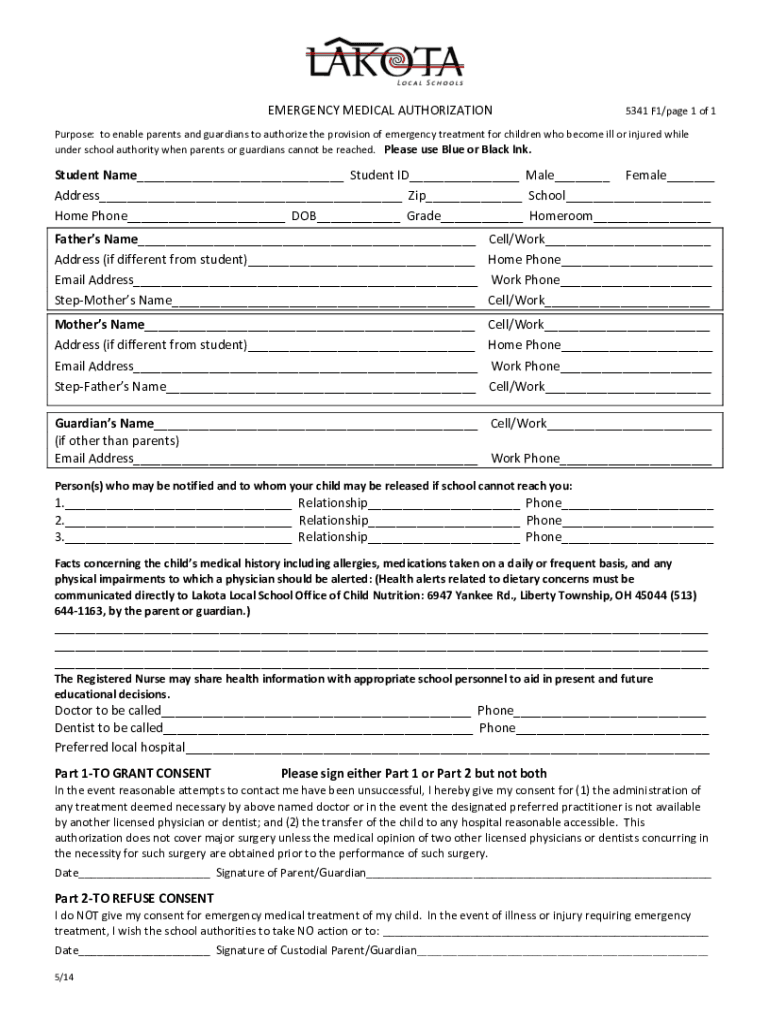 EMERGENCY MEDICAL AUTHORIZATION5341 F1/page 1 of 1Purpose: to enable parents and guardians to authorize the provision of emergency treatment for children who become ill or injured while under school