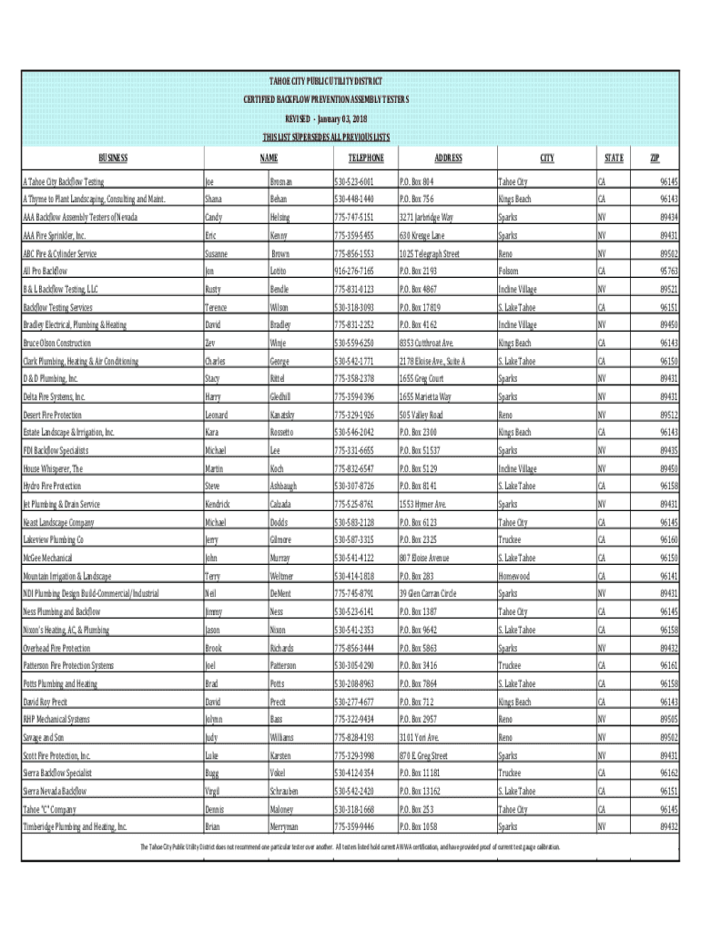 TAHOE CITY PUBLIC UTILITY DISTRICT CERTIFIED BACKFLOW PREVENTION ASSEMBLY TESTERS REVISED January 03, 2018, THIS LIST SUPERSEDES ALL PREVIOUS LISTS BUSINESSNAMETELEPHONEADDRESSCITYSTATEZIPA Tahoe