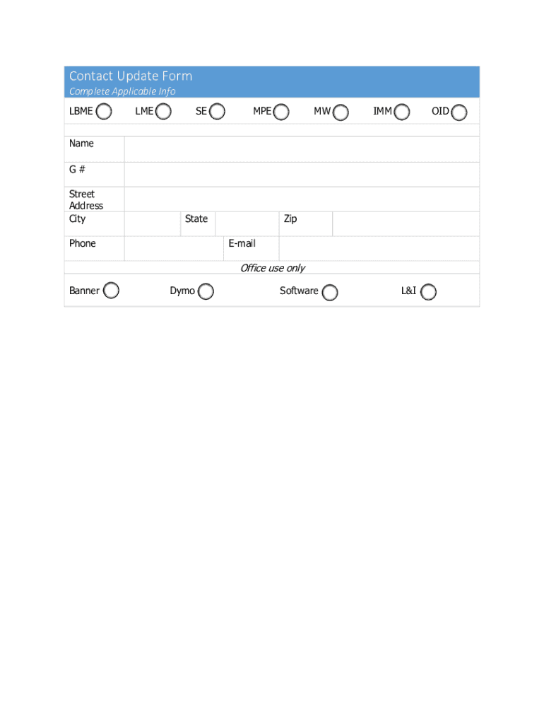 Contact Update Form Complete Applicable Info LBMELMESEMPEMWIMMOIDName G# Street Address CityStatePhoneZip EmailOffice use only BannerDymoSoftwareL&I